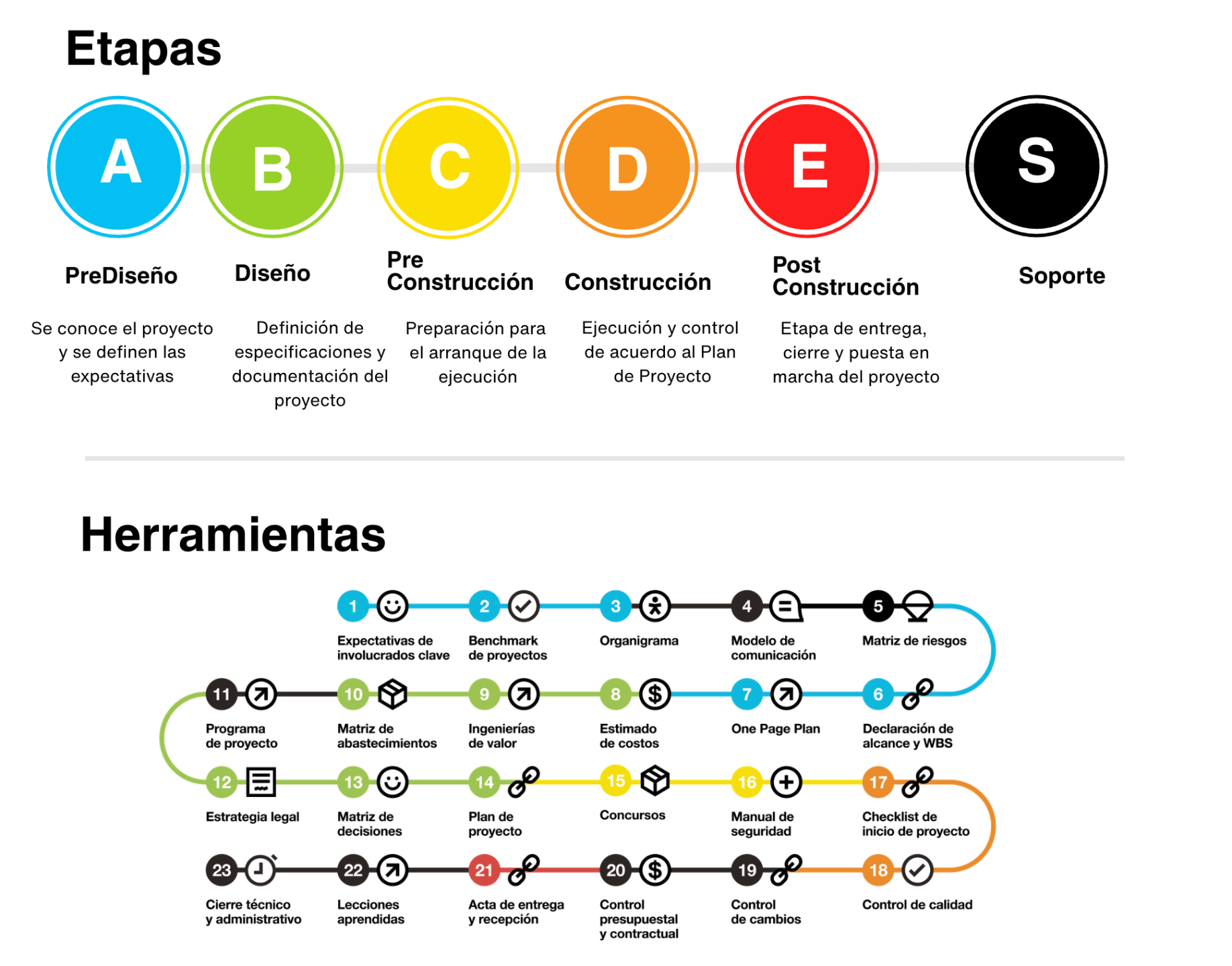 Nuestra metodología se construye sobre la experiencia real de más de 300 proyectos, alineada a estándares internacionales como PMI, IPMA y CMAA, y enfocada en el cliente y en el desarrollo de competencias técnicas y de gestión.
